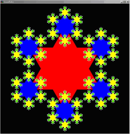 虽然修CS5的整个体验中有些小小的不愉快,但我还是受到了how to solve problems computationally的启发,产生了一种想要去学习更多的热情。于是乎,在大二的第一个秋季学期,我修了第二门计算机课程CS 8。CS 8也是入门级的课程,但是它的curriculum在当时是全新的,是用Haskell语言编程来学习Functional Programming。能够学以前别人没有学过的内容总是很令人兴奋,课程的内容也很丰富,包括用Functional Programming来实现动画,分析生物序列,搜索社交网络,解析和操纵HTML,识别数据集群,解决Sudoku难题,编写俄罗斯方块游戏等等。记得当时第一个Lab任务就是用递归的方式去画一个雪花fractal,如图所示,短短50行Haskell代码,就可以画出这么一个界面上显示复杂但是逻辑很清晰的图形,在当时觉得非常得酷。